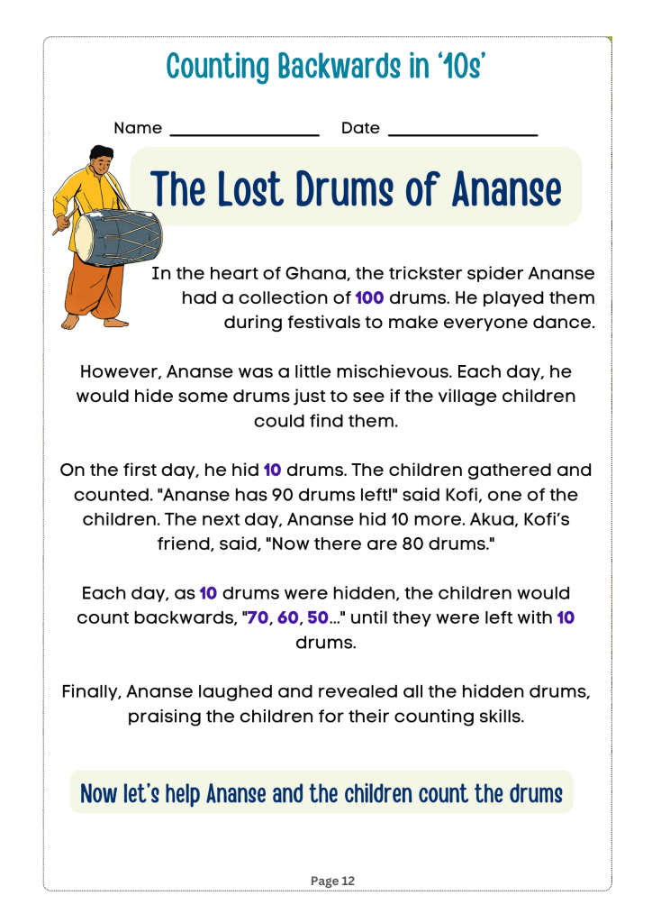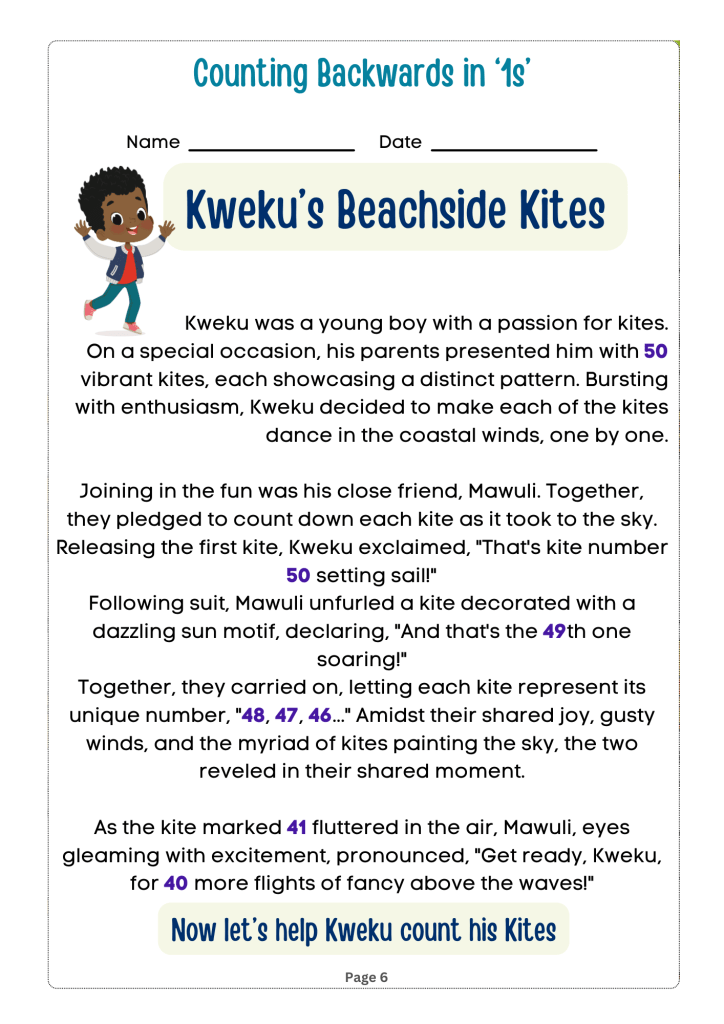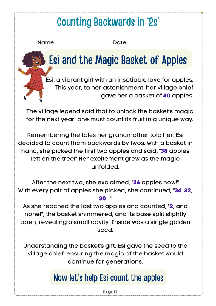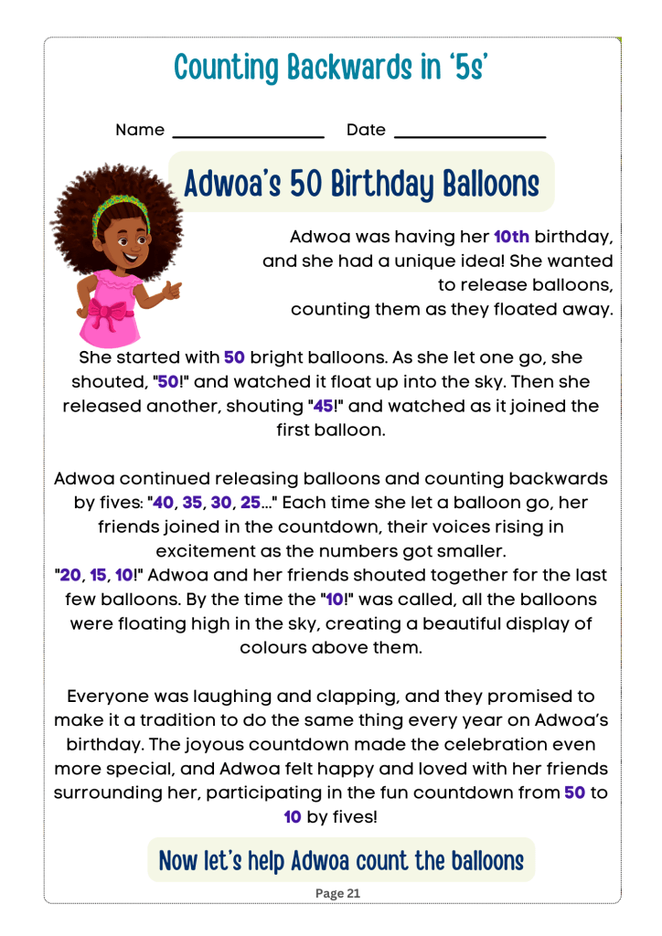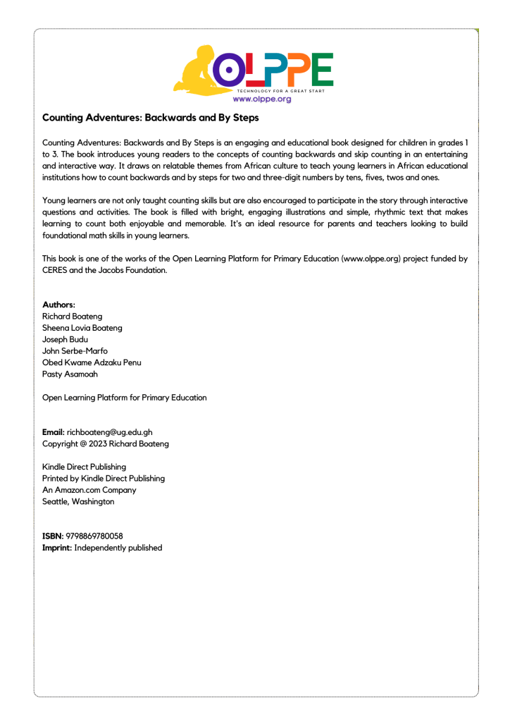 Counting Adventures: Backwards and By Steps is an engaging and educational book designed for children in grades 1 to 3. The book introduces young readers to the concepts of counting backwards and skip counting in an entertaining and interactive way. It draws on relatable themes from African culture to teach young learners in African educational institutions how to count backwards and by steps for two and three-digit numbers by tens, fives, twos and ones.